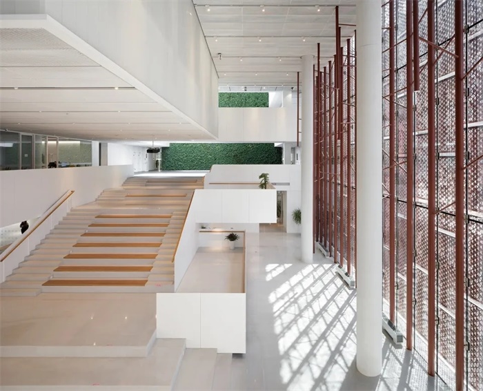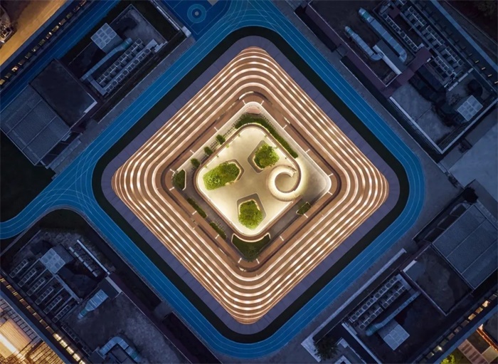 建筑群整体遵循外高内低,外刚内柔的策略——新建高层塔楼及板楼弥合了现状高层办公楼的天际线,并对着西侧开阔的城市界面及河道景观打开,形成了一个巨大的绿色生态“山谷”,小体量的红砖建筑聚落则嵌入山谷内部,与山谷中的绿色景观相融,共同构建了一幅生态、活力、舒适的小镇场景。