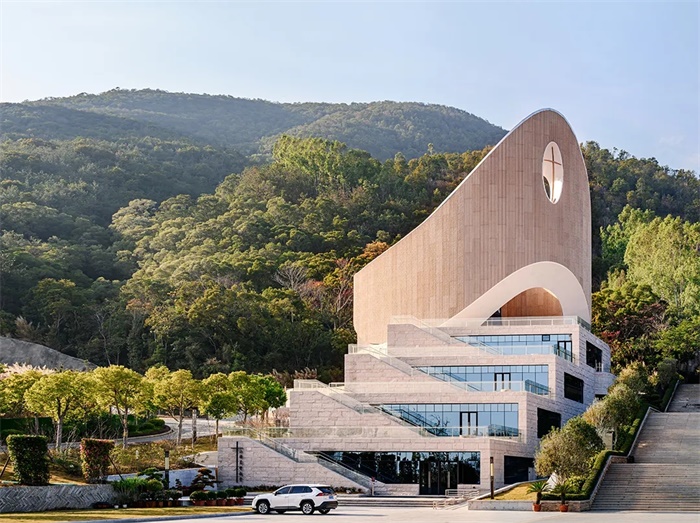 在被这一意象所打动的同时,我们也意识到项目的局限性,因此我们的方案由两种元素组成:建筑下部以花岗岩板包裹,看起来像阶梯状的岩石地基,矩形结构可以灵活调整空间分割,满足各种世俗使用需求;而顶部是教堂的中殿,唤起人们对抽象方舟的想象,以具有纹理的GRC面板装饰。这样既避免了从字面上转译意象,又能微妙地表现故事情节。
