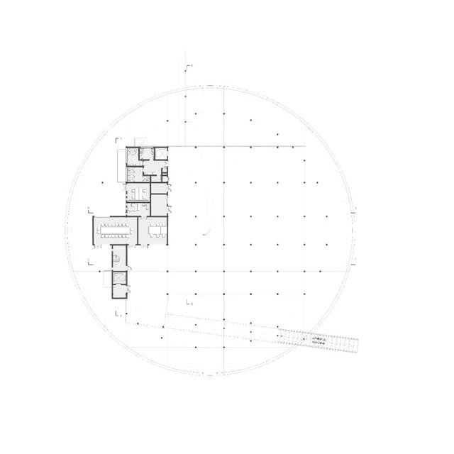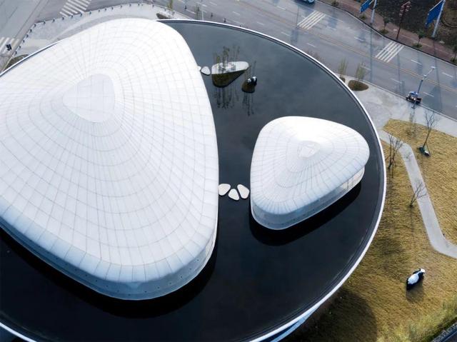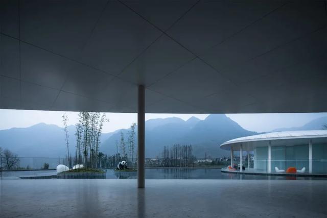 底层的柱子似竹林般向上生长,开放挑空的空间形成社区文化共享的小天地。中部建筑取熊猫悬卧于竹林之巅的意象,构建悬浮的半球。屋顶的浅水之上散落着两块“浮石”, “浮石”之意源于龙门山 “冰川漂砾”地质活动所形成的飞来峰巨石和湔江河谷中的江河浮石。熊猫的局部形态及黑白色彩,成为室内空间、家具、软装等的熊猫主题元素。