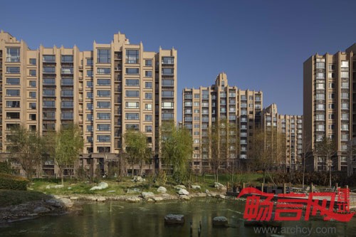 本项目基地分为东西两个地块。基地东侧及西侧道路两侧均有30米城市绿化带,西侧地块中有规划的城市公园用地,面积达2.9公顷,这些大面积绿化用地使东西两个地块具有天然的景观绿化优势。设计中充分考虑这些优势因素,力图创造一种融合的区域景观体系,将城市公共绿地和社区内景观绿化充分结合,有机互补,通过一条贯穿用地东西地块的中央景观绿化带将社区绿化串联成一个庞大的社区绿化系统,同时通过这条中央景观带将东西两部分的城市公共绿化联系起来,形成一个充满活力的城市区域景观绿化体系。绿化景观从中央景观带向周边组团渗透,形成支线景观系统,串联各个组团景观和组团内邻里交流空间。使整个社区9个各具特色的组团相互联通又各自独立,开放中不失私密和归属感。中央景观带及各重要景观绿化节点均设计了具有特色的水景空间,各个组团内部的邻里交流空间、广场均有水景设计,特别是中央景观带中设计了一条连贯东西的水系景观,并在水系两侧设置蜿蜒回曲的人行景观步道和亲水平台,使社区居民能够在休闲、散步、归家的途中体验溪流、叠瀑、喷泉等等特色水景,突出体现了社区的滨水景观优势,遵循顺义新城滨水而居的规划目标。