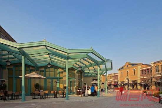 购物村的三个环线通过横轴连接,创造便利的可达性,这些横轴都涉及为步行街景空间的形式,通过乔木和特色元素创造一个放松的会见和休息的场所。在这些横轴的景观组成当中,视景是一个重要的元素,每个连接轴线都导向毗邻区域的景观节点如中央水花园和阳澄湖;还通过线性的铺装和种植图案来加强街景特征。