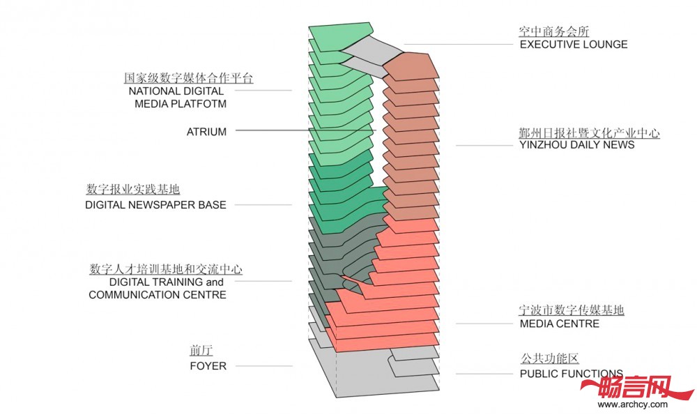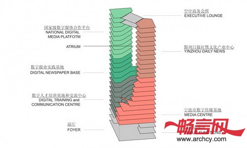 此项竞标的主题是为数字媒体建造一个出版社。该大楼应有一下功能:它要包含不同的网站公司的编辑部门、宁波日报大厦、一个国家媒体资讯台和一个多功能辅助区域。