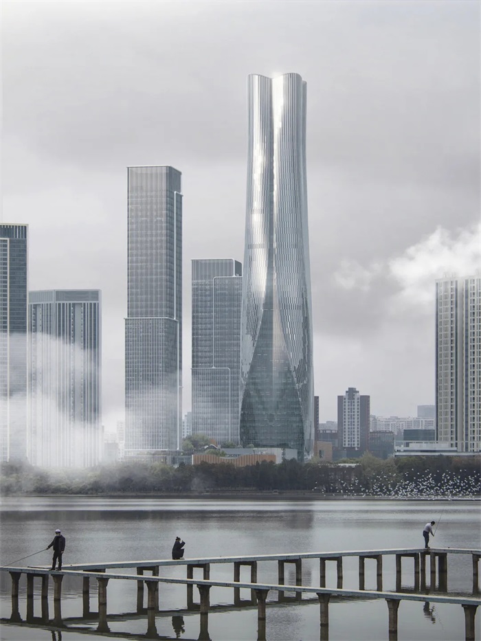 由于基地南侧紧邻长江主河道,建筑设计力图回应武汉城市独特的地理水文特征,超高层建筑以扭转起伏的表皮呼应汉阳两江交汇处江河汇聚的自然意象,一系列层层跌落的景观露台可以近眺长江奔流的景象。顺势而下,综合体建筑裙房尺度消解如润石一般,与塔楼形象互动,形成水石相映的有机整体。