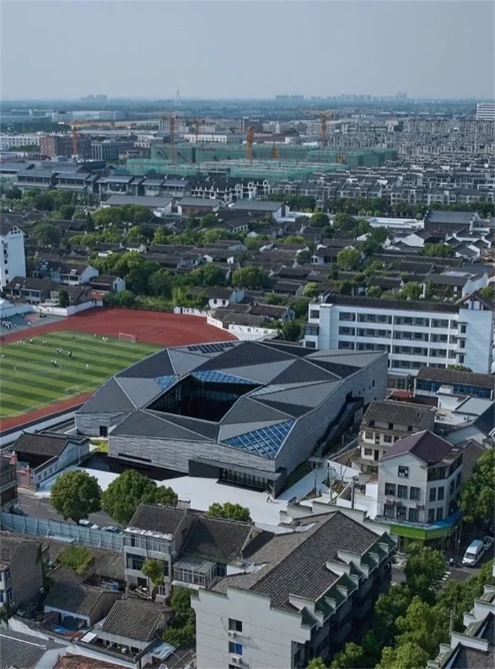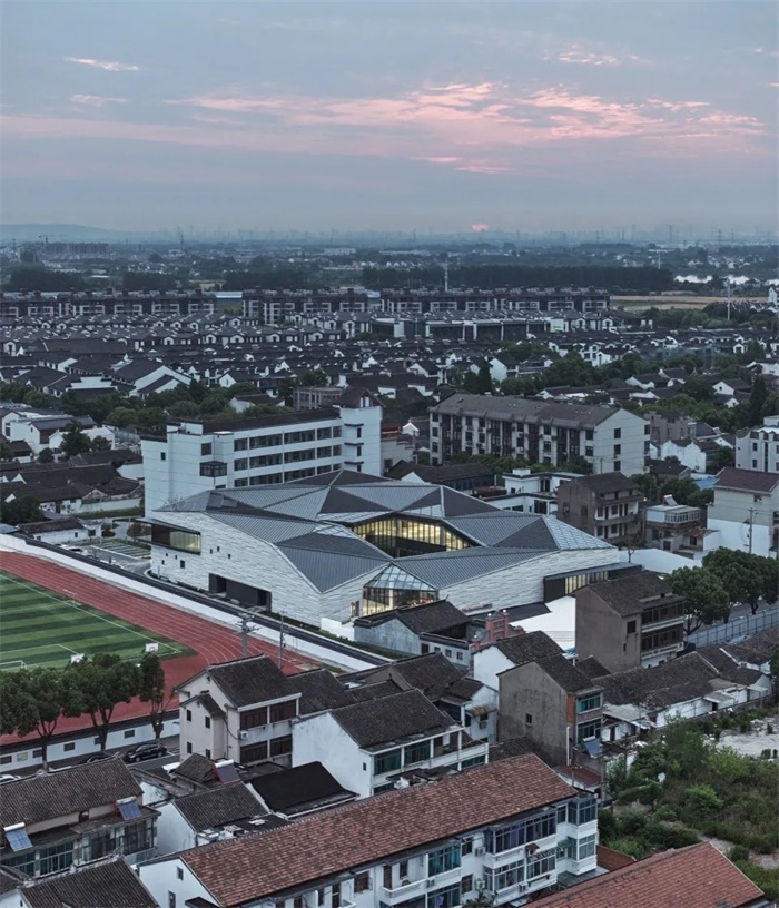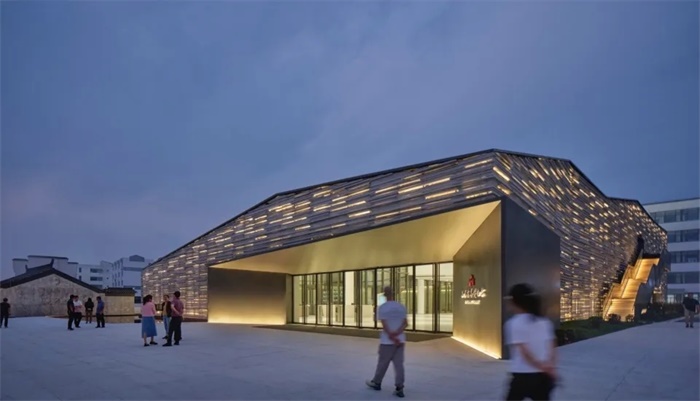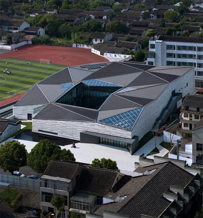 为进一步融入古镇风貌,消解建筑体量,融入古镇肌理,设计团队对古镇建筑群组、单体及院落进行调研,提取出12m-15m的建筑及院落空间尺度,基于此研究,以化整为零的手法,将博物馆屋面划分为11个 12m左右的结构单元。结构单元四个角点高度,一方面顺应建筑的跌落式限高控制,另一方面结合古镇建筑传统坡屋顶形制,形成多向翻折变化的单元式屋面,以其独特的折面和层次感延续古镇的文化历史,深色金属屋面与传统瓦屋面形成时空的传承对话。