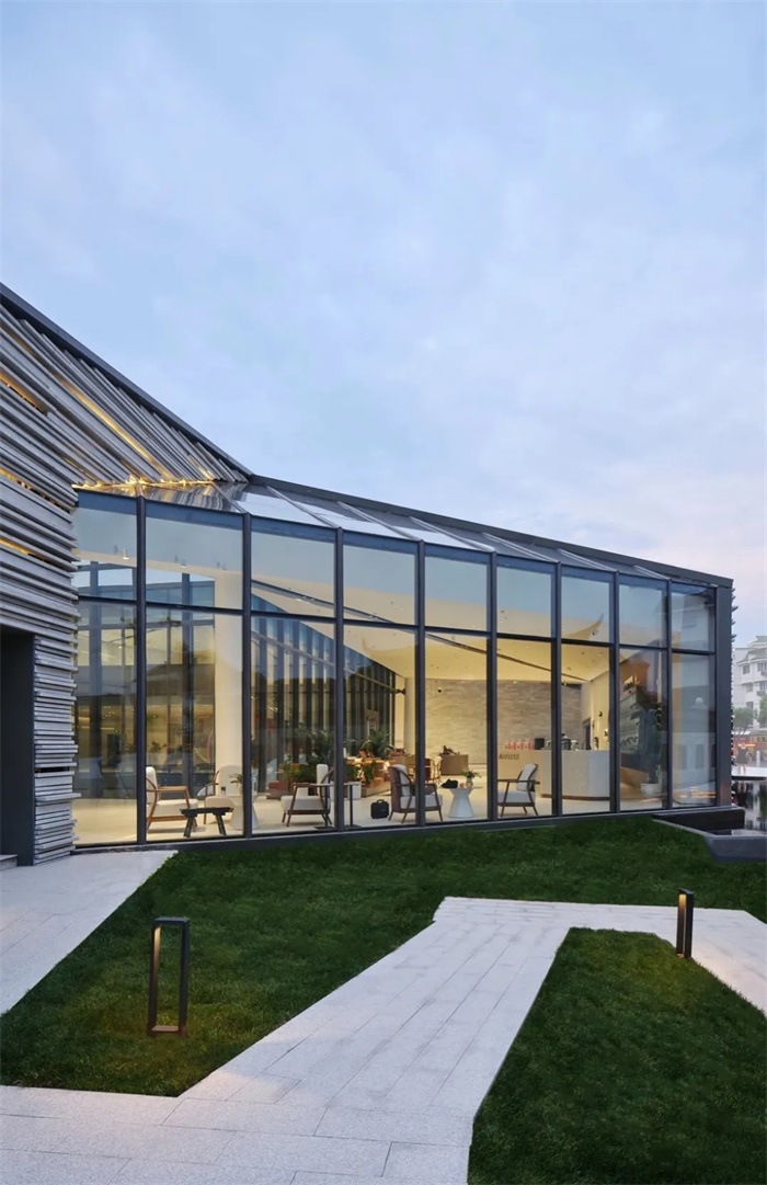 建筑中部在玉兰苑原址处设置室外中庭,最大限度保留玉兰苑庭院及古亭。在场地北侧不规则区域设置庭院景观,保留并强调与连接古镇的出入口,连通古镇、承接文脉。