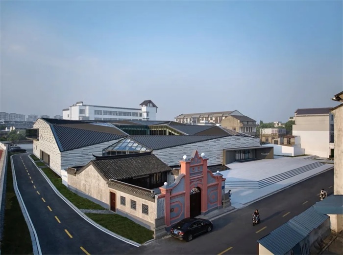 博物馆建筑体量根据现状场地的特点,遵循古镇的保护限制,设计建筑高度控制性跌落,从东北角的12m向西南角的鸿模小学旧址低俯至6m以内,最低处低至4.5m,与保护建筑屋脊同高,以一种谦逊崇敬的姿态与文保建筑对话,同时对北侧高楼进行适度遮挡,既满足了古镇保护规划的限高要求,也对城市空间视觉适当的更新。