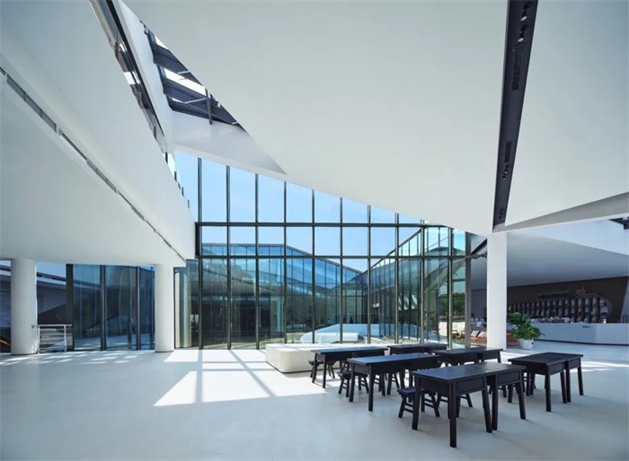 建筑布局在西南角进行切角并后退处理,形成过渡性的景观庭院空间,意与文保鸿模小学旧址形成尊重与对话,对遗存保护的同时也便于观览人流组织;