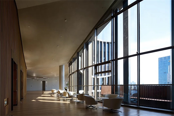 “云顶”是项目的另外一大亮点,是清水混凝土在水平方向上的展示。它在首层和十五层作为大堂和会议层的顶板,由室外延续到室内,不仅是立面的重要元素,也是室内的装饰吊顶。