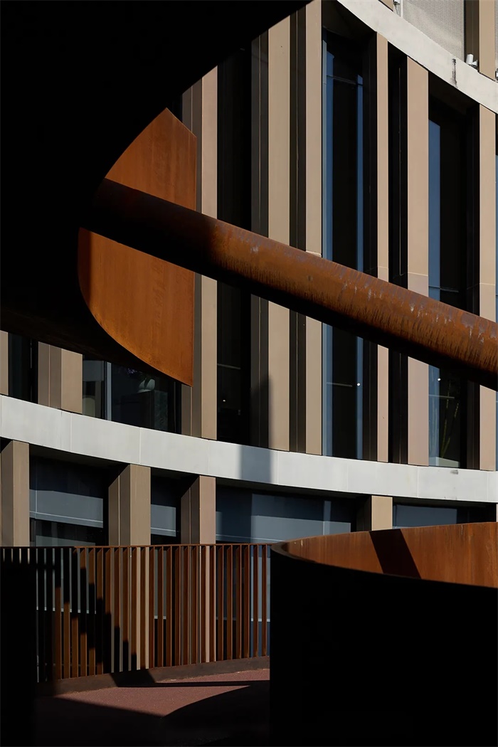 螺旋坡道采用了耐候钢,一是由于它的颜色和表征会随时间的推移而变化,具有生命隐喻,暗合了企业的发展历程;二是因为耐候钢体现了工业建筑“以结构为美”的特点,与建筑风格定位匹配。此外,其优良的耐候结构性能也非常适合应用在室外。