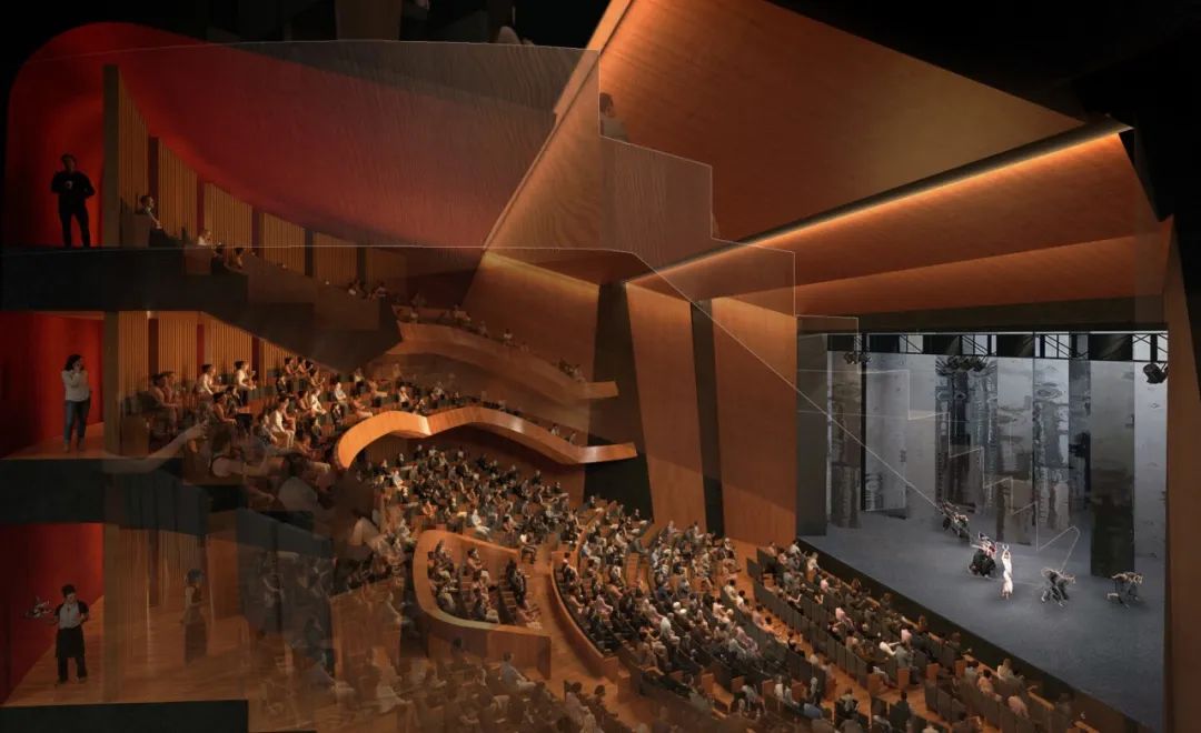 中剧场为可满足戏曲标准的多功能舞台,乐池区可升降作为扩展舞台或活动观众席使用。后舞台的后墙可开启,形成贯通式大舞台,满足不同规模和形式的多剧种表演。宽敞的前厅和室外平台提供了观演前的休息场所,平时也可作聚会、休闲、观湖活动等非正式舞台之用。