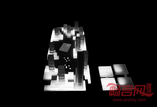 建筑由场地网格生成,呈现出简单的几何形体。最高的塔楼布置东北方向,与东北-西南的主导风向相对应,用来减弱强风对于开放空间和展示馆组群的影响。