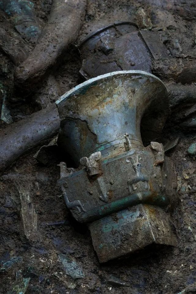2021年三星堆遗址考古发掘现场3号“祭祀坑”内拍摄的青铜器(3月16日摄)。新华社记者 沈伯韩 摄