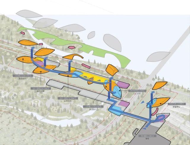 建筑群北向展厅及其他功能体块连贯而成一片起伏地景,覆盖在绿植屋顶之下。游人可从北边鸭子河畔缓缓走至二层屋顶绿地,欣赏360度园区风貌及优美江景。