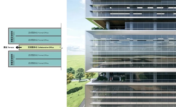 这两栋建筑通过一系列垂直堆叠的空中花园和露天连桥衔接起来,成就了一座空中会客厅,宛如一颗绿色“心脏”,使建筑与建筑之间形成鲜活的有机联系。这座由开放的公共空间组成的会客厅透过景观连桥、外部交通流线和活动露台空间的形式呈现出来,有效地将两栋建筑相连,使人们得以紧密地联系在一起。作为具有高舒适度的特色空间,这座会客厅意在使人们能从日常工作中短暂抽离出来,获得休憩与放松。