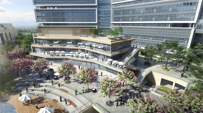 除了以上建筑组团,园区内还包括湖景餐厅等。其中,湖景餐厅建筑共有三层,餐厅正面沿着湖景轮廓线设置,室外设有餐饮区域、休憩台阶及亲水栈道,二三层则配有户外露台,下方与下沉广场相连,方便人们通过地面或地下通道抵达聚餐位置,在享受餐饮服务的同时欣赏优美的湖景。