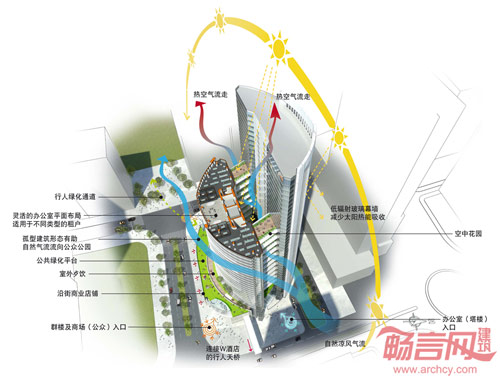 弧形外观:南北两座办公大楼的平面设计合拼呈半圆形,中间由左右交错的中央花园和空中走廊连接。弧形的外观独特实用,为每层办公室争取最佳景观之余,更有助自然气流流向公众公园,维持风透度。南北两区以中心旋转对称,左右平面相错6.70米,相距14-20.35米;空中花园宽约17米多。整体的主立面以中轴线转45度,减少与相邻建筑对望,同时提供更大空间和更佳的风透度。