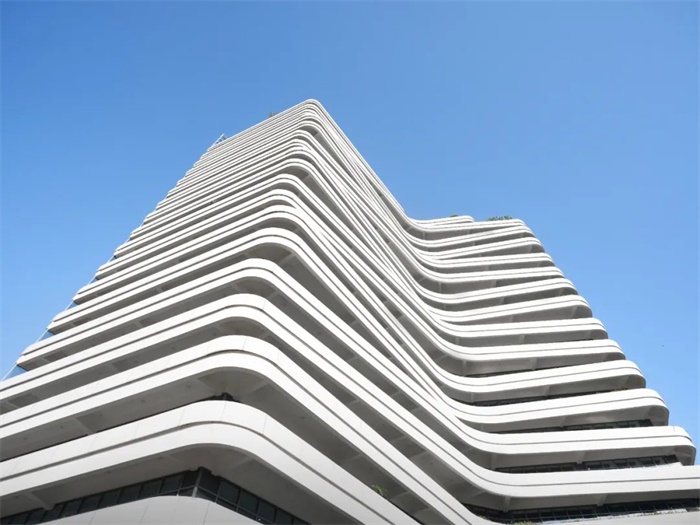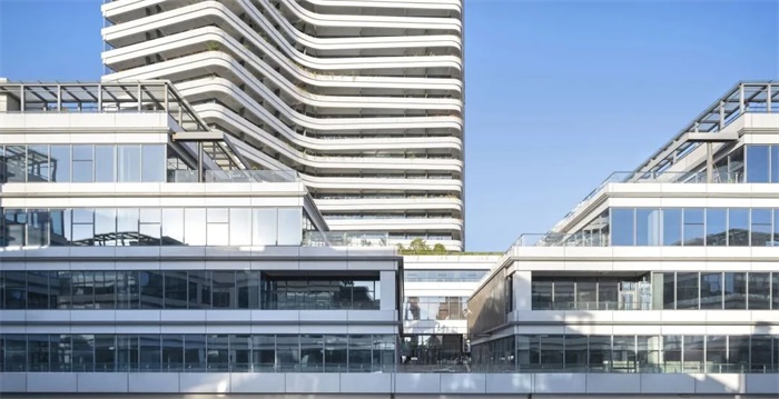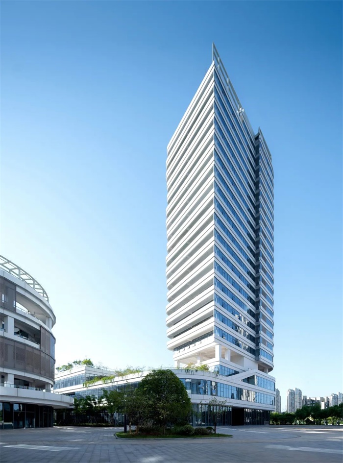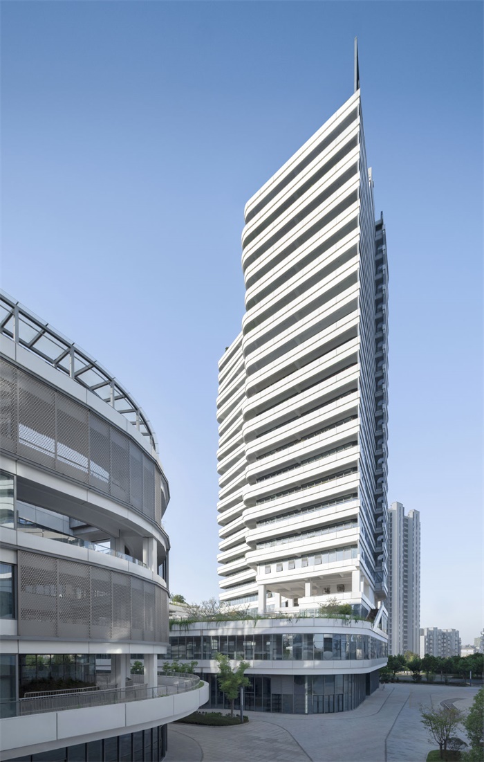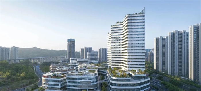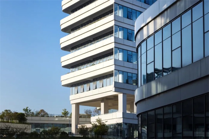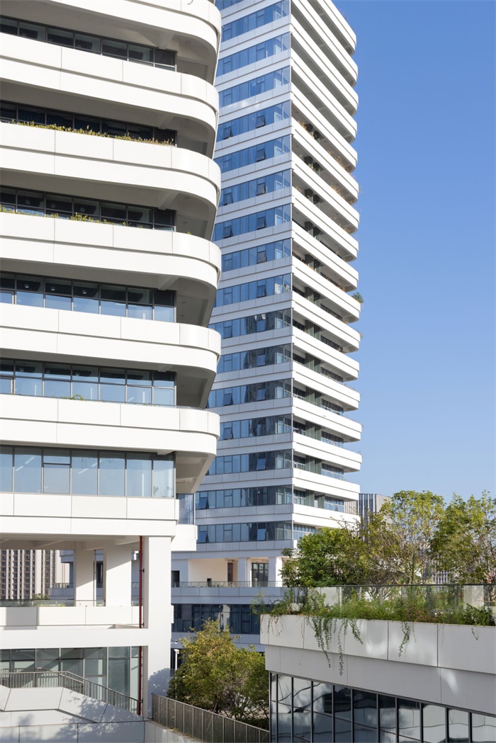 在压缩建造成本的控制下,立面以非玻璃幕墙的形式精细化高品质表达,错动而富有韵律的白色条带结合露台及外廊层层叠翠的绿植景观,为人们营造“立体花园”式办公环境,出挑的风雨连廊串联起每一个空间,实现产业圈层的共享与交流。
