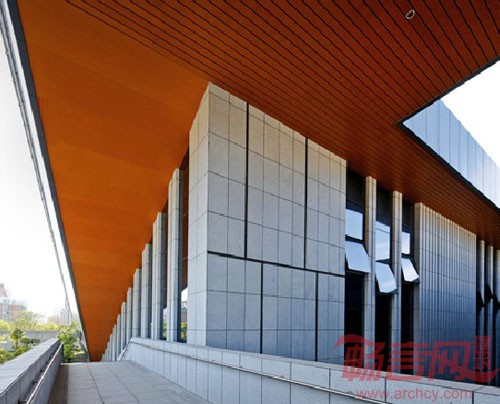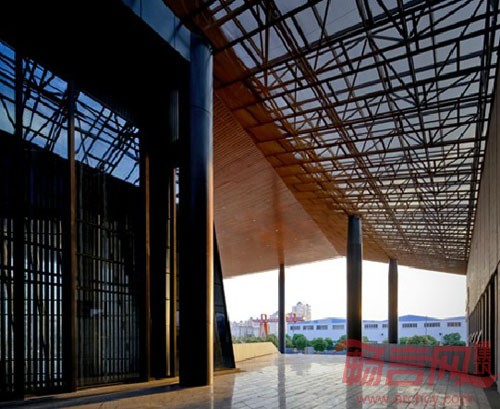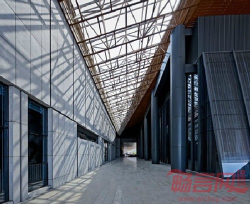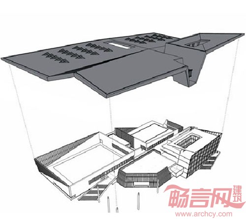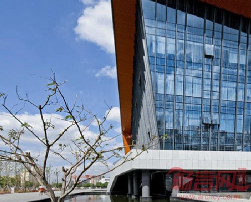 该项目设计的主题为“江南映象”。层层叠叠的青瓦屋顶,灰白的墙面,交错的水系形成了江南建筑独特的美,设计师在设计中采用了折叠错落的深色大屋面,与江南建筑连绵起伏的屋面产生通感,赋予了文体中心独特的建筑形象。粉墙黛瓦,绿影婆娑是江南的色调。文体中心采用深色金属局部辅以丝网印刷玻璃与穿孔板,再配入绿色植物,形成黑、白、灰、木色为主的色彩,以现代材料,通过写意的方式表达对江南传统建筑与文化的敬意。方案设计借鉴了江南传统建筑的庭院处理,依据宜人游走的步行视觉逻辑,在建筑的不同功能之间插入以竹、沙、石、水等主题各异的庭院,形成了多层次的空间体验。