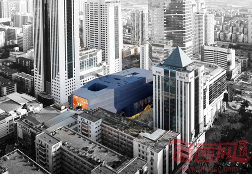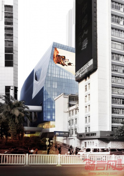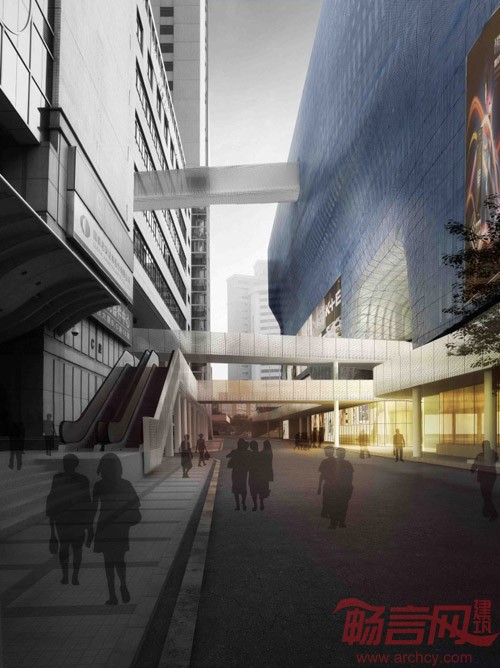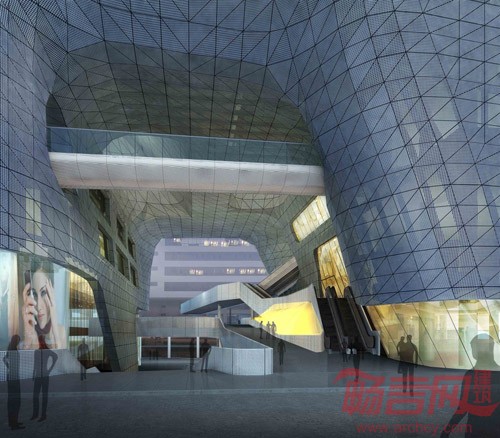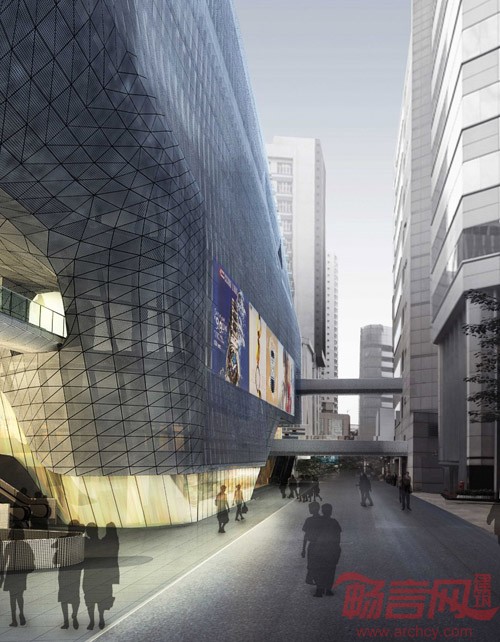 建筑表面打孔金属板的整体包裹满足了多层车库的采光通风要求,建筑形体反映了基地的空间限制,而试图挣脱这种限制所产生的扭曲的表皮也造成了强烈的视觉效果。大楼中部被开凿出一个巨大的城市通廊,它既是过街装置,又通向商场的入口。此外原有街道穿越的方式也被保留了,并用多方向的坡道做了有次序地引导,使人流在穿越建筑物的同时能够方便地进入到各个商业楼层。巨大的采光井将自然光从高空引下在通廊内弯捲的曲面上随时间而变化,每日几十万人流将从这里穿过,形成一种壮阔的城市图景。