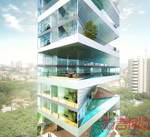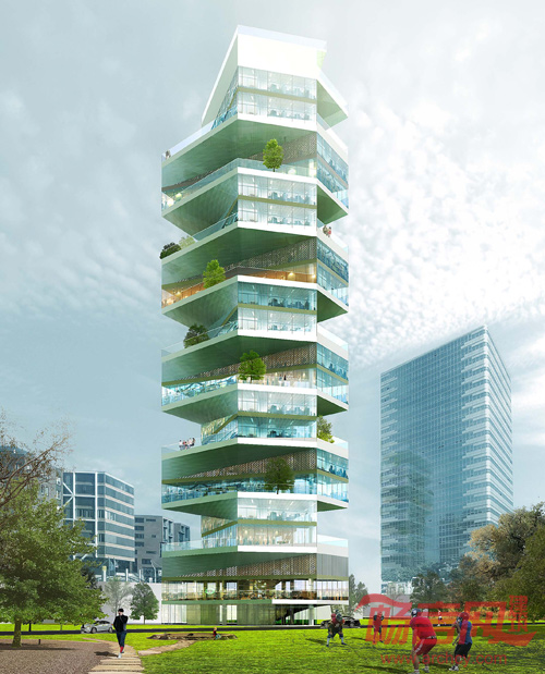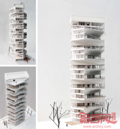 四年一届由ARQUIA举办的高层住宅设计大赛是一项吸引众多国际建筑师参与的大型竞赛。2012年的设计场地位于秘鲁首都利马繁华的住宅区,拥有得天独厚的自然海景和高尔夫球场以及市民公园——发展商致力于挖掘建筑形式中的艺术感,给予参赛者充分的自由和想象空间以期许他们赋予这块地处热带却温和湿润、冬暖夏凉之域与之想偕的独特高层住宅体验。平面上扭曲的塔由45度交错的两个长方形构成并且在垂直维度上互相铰合——这种安排满足所有住宅单元享受无遮挡视角,一览公园及太平洋海景。同时,亦避免了上下层邻里之间的视觉干扰,创造了极尽奢华的私密体验。每一单元为一户双层公寓,拥有与室内面积几近相等的露台、花园及私家泳池。独特的几何平面让每层露台都能接受利马热带温润的阳光和风露。两户单元之间的金属吊顶柔顺化两个方正的体量,将视线从建筑结构本身拉长至远景。与其相交的二层三角形金属网墙面则不仅减少了多余的光线且,其渐收的形态亦与吊顶相互呼应。作为一次将现代设计趋势融入竞赛作品的实验,零壹城市在尊重利马当地传统和城市肌理的考量下完成了这一作品。