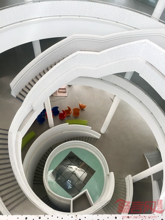 建筑内部没有传统空调,制冷供暖依靠的是全新的地源热泵技术。每层楼板厚度为30厘米,中间预埋了具有蓄冷蓄热功能的TABS(热辐射管道系统),分别与地下21口100米深井里的U形管相连。冬季,热泵机组从岩土体中吸收热量,向建筑物供暖;夏季,热泵机组从室内吸收热量并转移释放到地源中,实现建筑物空调制冷。