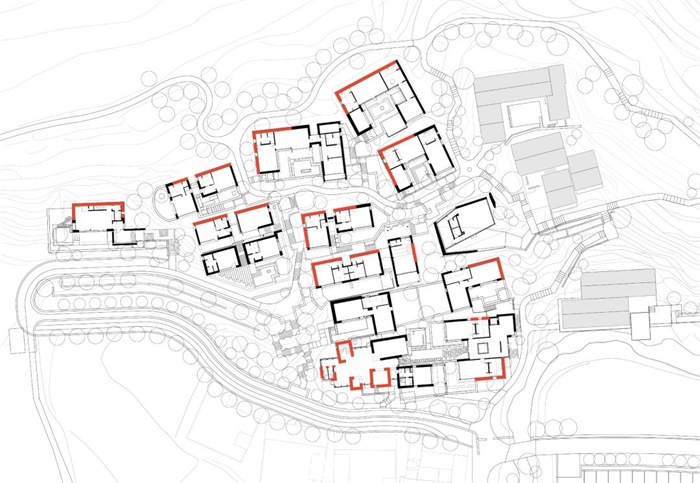 面对多重挑战——如何将存量宅基地及集体建设用地有效利用?如何为贫困村引流,产生经济效益,使其可持续发展?我们提出双线并行的设计策略,一是做针灸式的改造,在保持宅基地边界不变的情况下,以存量建筑的空间激活和原有环境的生态修复为切入点,从而实现旧村落的新生,二是通过建立公共空间来激发可以引流的媒体效应。将场地内现有宅基地改造更新为度假酒店,利用少量的集体建设用地指标打造一组具备媒体引流效应的公共建筑,兼顾酒店的公共配套。
