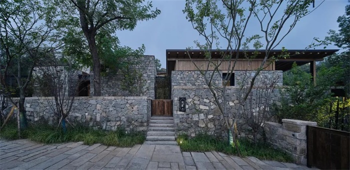 一、二、四号院,场地现存建筑为近期新建的石屋。设计保留了部分毛石墙体,梳理了建筑和场地的关系。一号院有一棵树木,建筑围绕树木形成内庭院。二号院和四号院形成L型的围合院落。