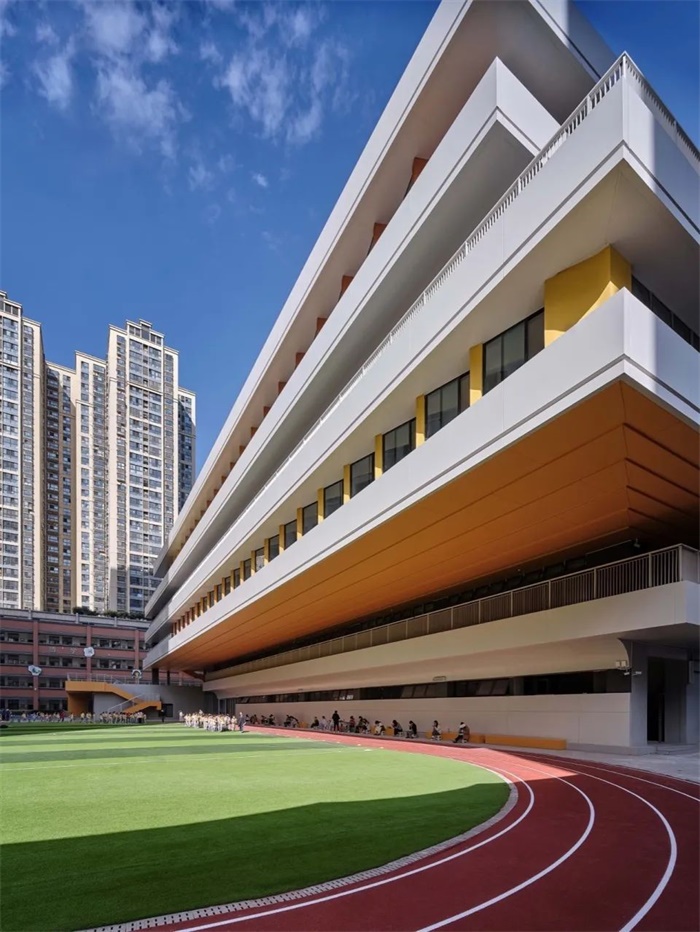 在如此紧张的场地中,置入任何建筑物都会显得十分强势,同样也会挤压有限的地面空间。出于对教学功能需求和室外空间感受的平衡,设计团队决定将建筑的半边悬浮起来,把更多的场地还给孩子们。经过日照计算,新建教学楼的位置选定于校园东侧,以保障教室获得充足的日照采光。我们将新建教学楼的西侧部分出挑约8m,挑空两层(高度约9m),上方3-5层承载普通教室和社团活动室等功能,满足了学校的使用需求。建筑挑空下方则是穿越而过的操场跑道。建筑的“悬空”使完整的操场得以保留,让每一个孩子享有“运动权”。