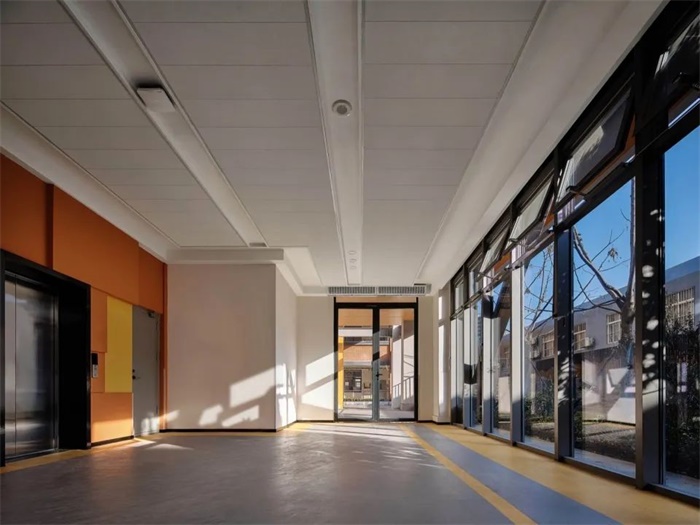 设计通过“悬浮”的方式,将建筑占地做到最集约化。考虑到学校未来长远的发展,仅靠地面难以承载2000余名师生的教学与运动需求。因此,设计不止于保留操场,我们试图将学生引导至教学楼各个楼层的室外平台,使校园外部空间立体化、分散化,从而解决活动场地不足的问题。因此,设计团队对综合楼各层空间进行水平错动设计,形成不同尺度、适宜的室外活动灰空间,并将被新建教学楼占据的篮球场放置在屋顶。通过室外楼梯,使学生活动动线由平面变为立体,营造从地面到屋顶的连续化立体化外部空间,在用地有限的校园内创造了丰富多维的活动场地。西侧教室窗户采用折角窗的形式,减少教室受西晒的影响。渐变橙黄色点缀的折角窗,打破了水平向立面的单调形象,形成“叠落书架”的意象,体现出校园的活力生机。