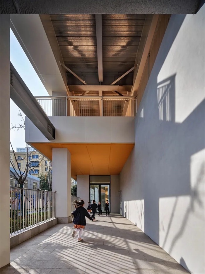 “悬空”的建筑以一种相对谦逊的姿态介入场地,通过挑空的处理方式减少其对场地压迫感,营造出对小孩子们足够友好的校园外部环境。建筑悬挑下方的室外空间足够高大,孩子们不仅可在下方举办各类活动,也成为他们一方遮阳避雨的室外乐园。