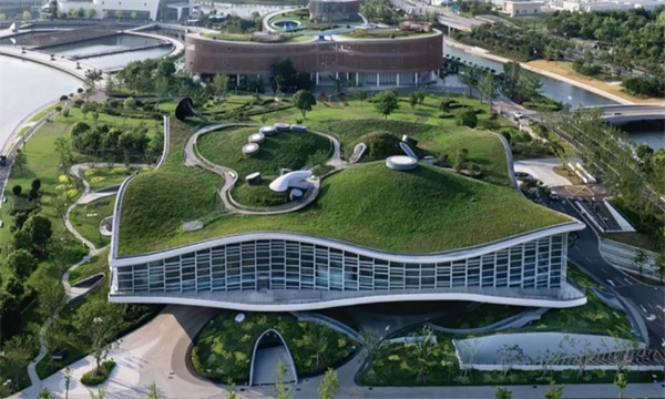 在上海五座新城的规划中,奉贤的金海湖是新城的核心景观。“在水一方”的基地近乎正方形,位于湖东的环形半岛上,东西两侧临水,是一座以科幻为主题的多功能文化地标。设计的走向源自选址和功能定位:建筑在景观空间上与环湖绿带取得协调的同时,也需要在内部体验和外部形象上建立自身的独特性。