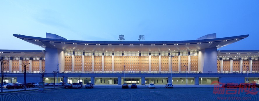 泉州站站房空间形态和立面设计新颖别致,建筑语言婉约明快。设计采用“极减”的现代设计理念,使建筑造型具有明快的时代气质,既照顾到历史与地方特色,又避免套用传统手工业时代的形式语汇;选用少量高新材料:屋顶檐口采用钛锌板,使处于高空的檐口成为带有金属光泽、非常精美的曲线。清新流畅的曲线划过天空,配合水平的条带玻璃,象征高速度的水平动态,加上富有闽南地方特色的红墙、白柱,尽显整体和谐以及现代化的建筑风采。