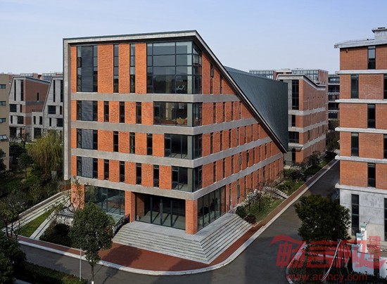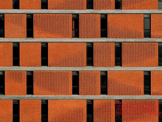 在单体建造方面,我们重点考虑的是降低成本材料及如何与数字化设计相结合。因此我们在设计中采用了直白的几何逻辑理性,通过简洁的构造方式,实现了传统材料的当代价值。通过对梁、柱、板等基本建筑元素的细节化处理,让结构直接呈现出建筑的本真之美。红色页岩砖、玻璃和混凝土等材料彼此真实反映了建造关系,营造出了一种朴素和简洁的整体性氛围。通过数字化设计手段重新使得传统的红砖砌筑焕发出新的魅力,传统的“丁-顺”砌法通过非线性的逻辑而加以重构,简单的定位与控制方式让工人通过简单的学习就可以加以营造,这也进一步控制了项目成本。入口会所屋顶利用有力的几何逻辑创造出了独特的空间景观效果,屋顶朝着人们接近园区的方向扭转与翘曲,反宇向阳,随着不同的观察位置,屋顶的翘曲与天空的关系也不断变化,同时直纹曲面的几何关系也使得钛锌板的铺设实现了精确的操作。