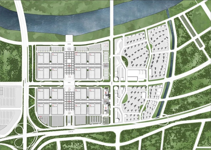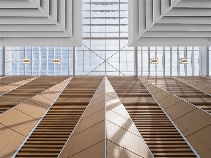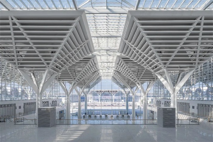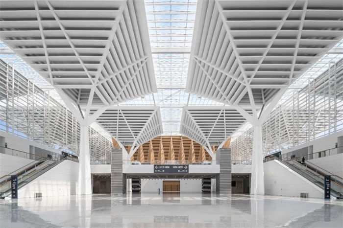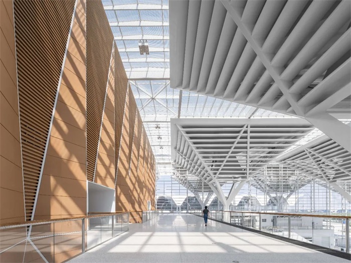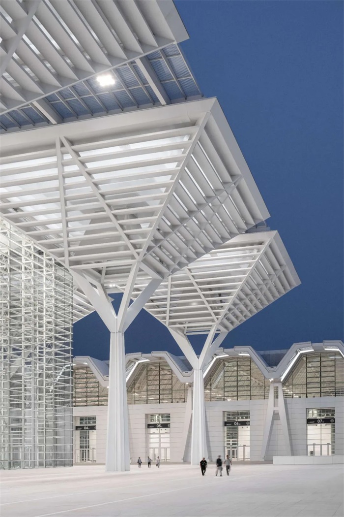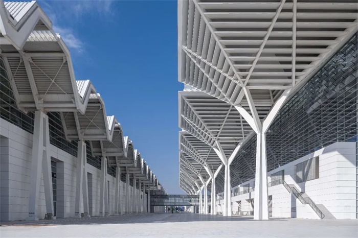 二期建筑平面同样采用了鱼骨式串联的布局,以中央大厅为中心,向两侧延伸的东西连廊连接所有16个展厅,并通过国展大道上方大跨度的人行天桥与项目一期连接在一起。