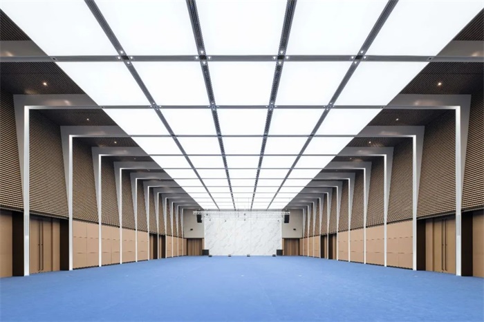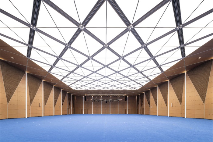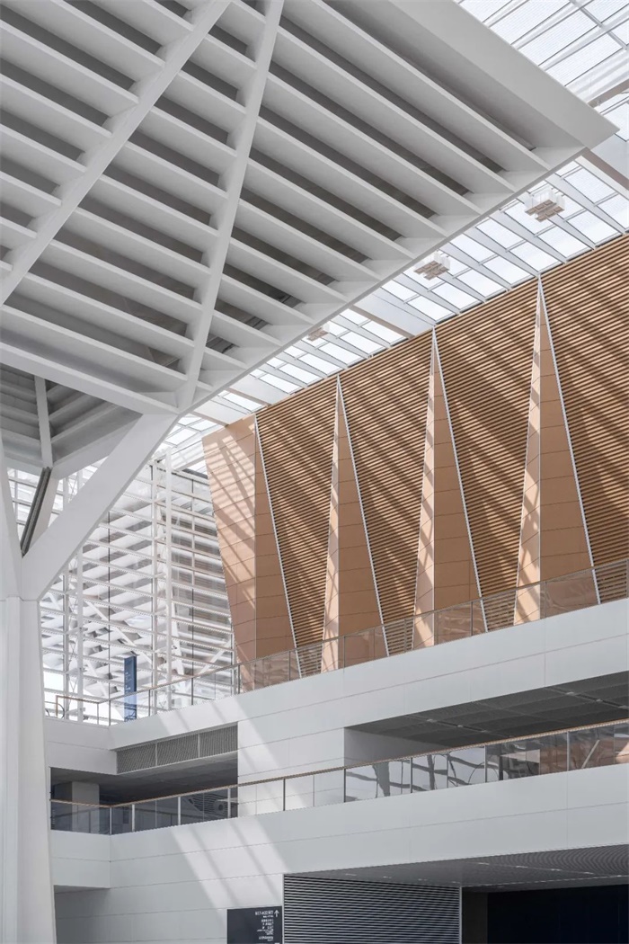 观众经由标高9.00米的中央大厅进入展厅,可清晰地辨别前往标高0.00米的所有展厅的方向。作为第二大功能的会议中心位于中央大厅的北侧,通过二层水平连接的通廊划分为南侧的参展登录大厅和北侧的会议中心大厅。