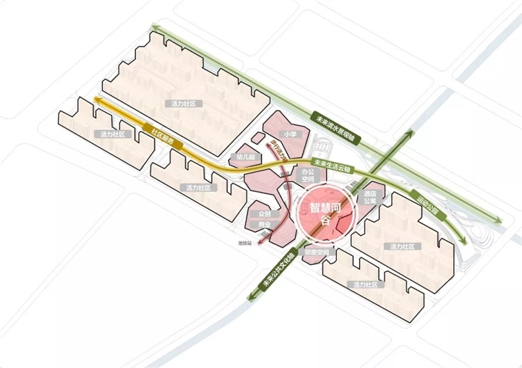 “三轴”:由盖上运动公园、小学、幼儿园、盖体边缘社区服务系统构建的未来生活云轴;位于区域中心,由智慧河谷、众创空间、邻里中心、商业等构筑的未来公共文化轴;南部沿着盖体边缘和河流打造别具一格的未来滨水景观轴。