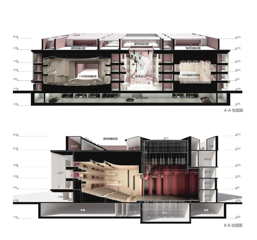 项目地上4层、地下1层,利用屋顶设置空中梨园,形成3个特色剧场与1个屋顶戏曲花园的“3+1”演出体系。剧场主门厅中央设置多媒体数字背景墙,兼顾非遗展示、艺术宣传等功能,营造浓郁的戏曲文化氛围。剧场顶部设空中梨园,以北京传统院落空间城市肌理为原型,形成融合戏迷交流、互动表演、休闲游憩、消夏晚会等功能的大众文化休闲空间,让艺术中心真正融入城市生活,与城市互动。