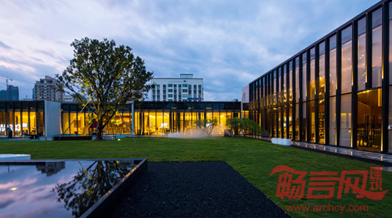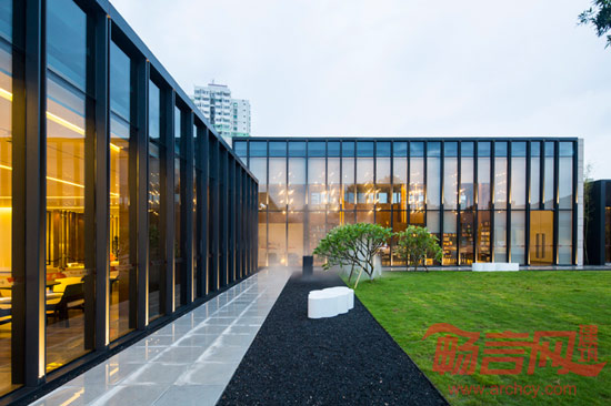在空间设计策略上,我们根据建筑场地周边比较混乱的城市环境,和各个城市界面的优劣差别带来的限制,将建筑整体空间定性为内向型,对东,南侧屏蔽,对西,北侧敞开;与此同时,考虑到场地内改造厂房巨大的体量,我们设计了一个围合的庭院,让厂房为庭院核心——”样板房梦舞台“的背景,从而与整组新建建筑形式一个互动的整体;最后,场地与周边城市道路两米左右的高差,也被塑造成为结合入口空间序列的坡地景观,成为建筑和城市的调节剂。