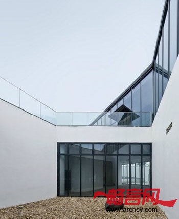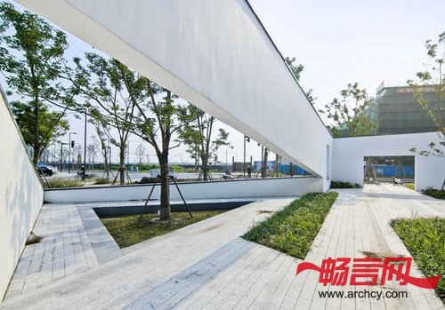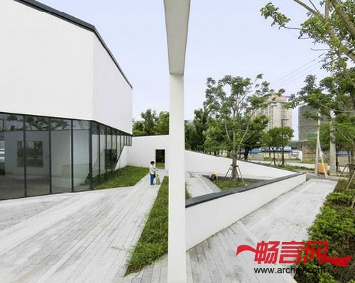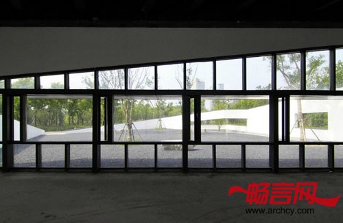 材 料:白色涂料、透明及印刷玻璃、深灰色铝合金、豆石、防腐木