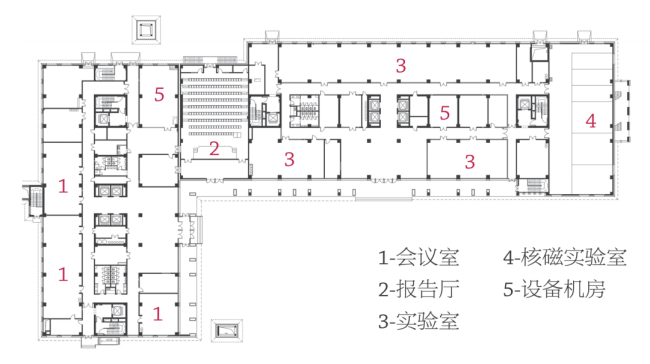 建筑首层为门厅、MRI 实验室等若干实验室,二层为公共实验平台,三层以上为各类实验室。为适应不同类型实验室的弹性需求,建筑采用双走廊的实验室空间格局,平面模块可以根据不同使用需要灵活变动。将药学实验室置于较高楼层,以使竖向通风管道距离缩短且减少占用楼层面积。动物实验室位于建筑顶部三层,以减少人员穿越,并利于通风。