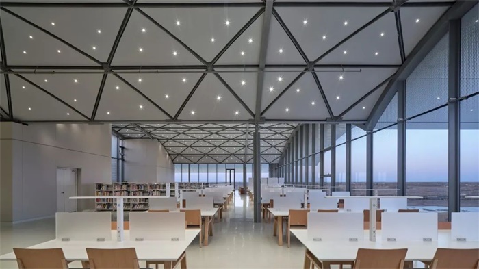 中国民航大学图书馆对“阅览一藏书”的二元功能体系进行重新解构。建筑主体分为结构核心、带状舱体、云上阅览三大体系,结构核心布置密集书库及竖向交通,并提供有力的结构支撑,带状舱体层层搭接,容纳通用阅览及办公空间,云上阅览厅置于顶层,营造平层无柱大空间。