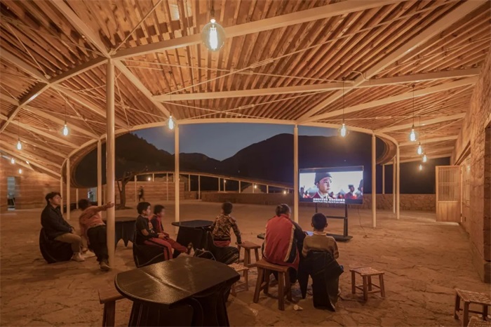 建筑主体材料夯土墙回应了村寨的在地风貌。建造方法为在特制木模板槽中倒入泥土,并以墙体平面为参考,人工分不同层次实施锤打并夯实。夯土配料中的红土可就地取材,其他材料可以直接搬运到现场。除造价考虑之外,这对深山山顶的施工来说,减少了施工机械的介入,体现了低技化的设计策略。