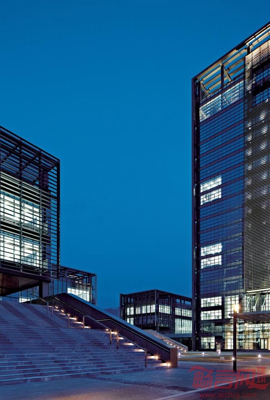 一体化的设计使主楼与裙楼的主从关系消解,且更适合功能需求。主楼与裙楼的立面表皮连贯,一气呵成。设计力图弱化主楼和裙楼的形态差异,主楼适应于较为内向型的办公空间,裙楼则更适应于外向型或内部联系更为频繁的部门。