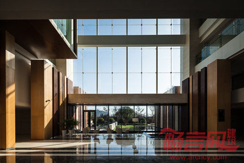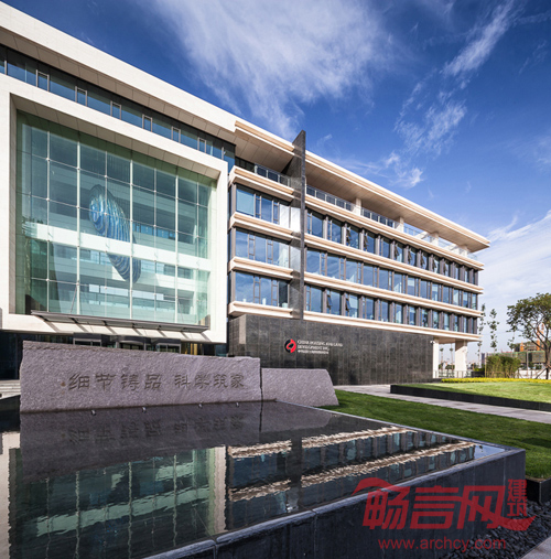 会所布置在西南侧,与企业办公形体分离,结合景墙、绿化水景景观的设计,形成极具特色的庭院式布局方式,营造了安静宜人的休闲环境。