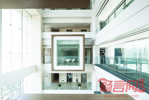 开放的办公空间打破了传统的分级办公环境,并有利于生态节能;每一个开放办公空间都有共享空间,如屋顶花园,庭院,中庭等,这些空间为不同部门、不同级别的员工们提供了良好的交流环境。