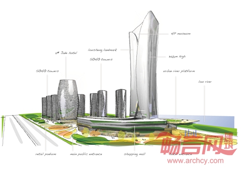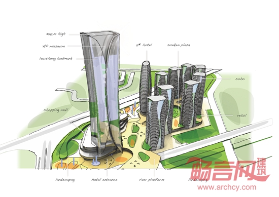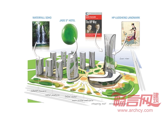 本案位于洛阳市洛龙区洛河南岸、牡丹桥西南角。地理位置优越,交通便利。基地周围文化氛围浓厚,临近隋朝遗址公园以及洛阳博物馆,与洛阳市最高建筑隔河相望。在这样的背景下,需要设计出一个标志性的外观,创建一个具有里程碑意义的建筑。项目作为惠普集团大中华地区的产业及培训基地,定位于“洛阳的中心-中原的焦点-中国的硅谷”的宏伟目标。