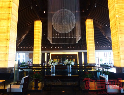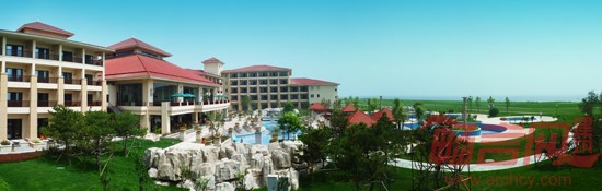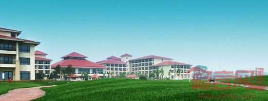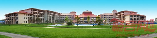 酒店主楼采用枝状布局,外立面采用东南亚风格,舒展的大坡屋顶,木质的构架,草编的饰物着重塑造酒店的休闲度假氛围。尽最大可能保证客房观海景,同时利用周边起伏的沙地,高尔夫果岭,露天泳池等营造内部景观。在环境设计中强调多层次的院落空间的构成,以大面积的水景,曲折自由的园路,丰富的对景和精致的小品,结合自然山体、海滩、浓厚的植物群落,创造一个融山、海、水、花于一体的旅游休闲度假环境。