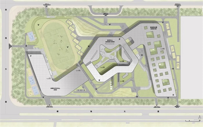“S”型建筑带贯穿整个校园,有机地连接了生活、教学和体育区域。从 “云”学习中心的中点开始,建筑带向上升起,在一侧的宿舍和另一侧的体育中心达到了全高。