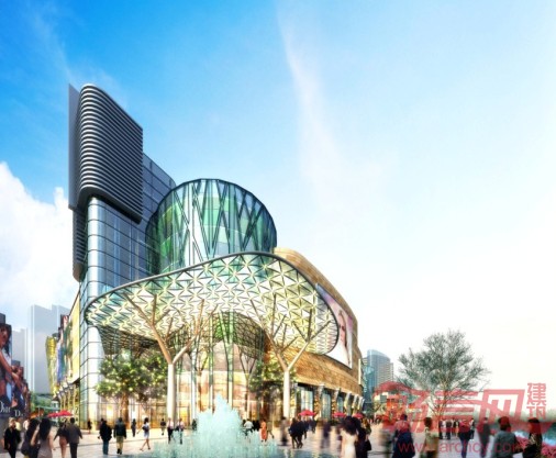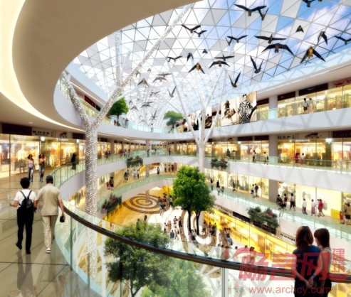 购物中心是以森林为主题的特色空间。造型独特的树形柱子,支撑起象征天空的轻盈的钢结构玻璃采光天幕,创造出一种现代都市森林的意境,表达了黑龙江作为广茂的森林之省的地理文化特征,又为人们提供了四季皆宜的高品质室内购物环境。“四季圆厅”是购物中心的主要出入口及共享空间,按“春、夏、秋、冬”四季命名。分别以草绿、深绿、橙红、蓝灰作为主色系,创造富于现代特色的视觉体验与较高的识别性。采用彩色玻璃印刷技术与植入LED光缆技术相结合的手法,将森林与色彩融合在一起,成为别具特色的富有文化品位与现代感的商业入口空间处理。夜晚,LED树形产生极富视幻效果的灯光照明变幻,成为进入“森林”内廊的序曲。“水厅”位于购物中心中部,结合河边大型喷水广场,设有凹弧形玻璃幕墙厅,为购物中心内的人们,提供了观看河景以及抵达滨河公园的舒适空间,略微倾斜的屋顶有瀑布水流向上而下流出,成为建筑一个有趣的景观。大面积屋顶花园、屋顶体育公园提供了多层次立体化的室外绿化空间和宜人的活动场所,提升了本区的环境品质,充分发挥了绿化的生态效益。创造出独具特色的园林风格。
