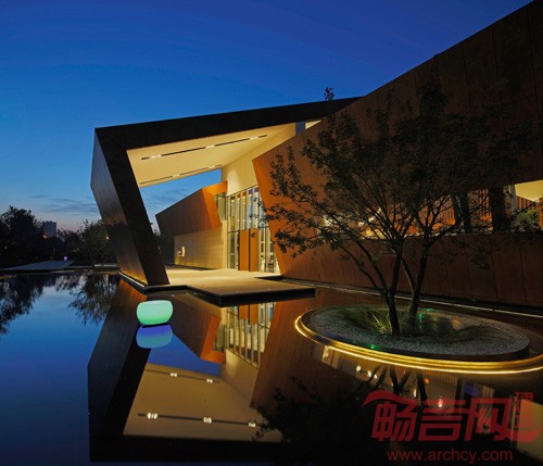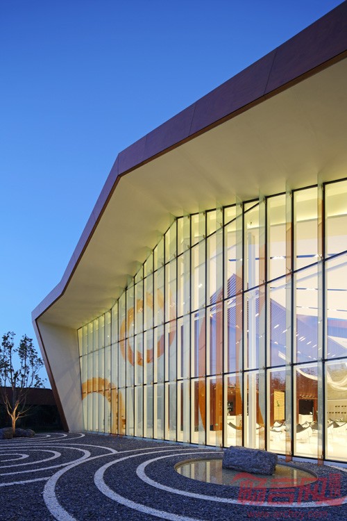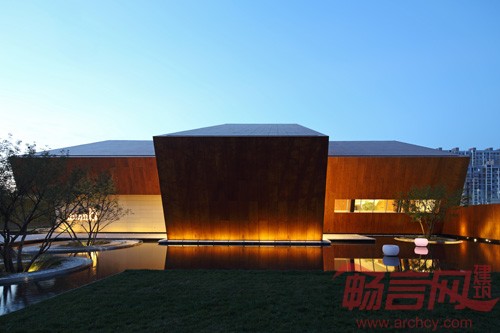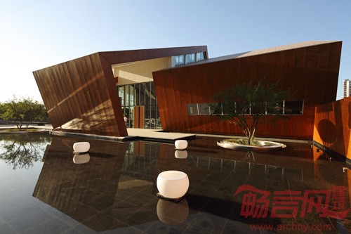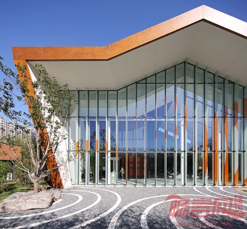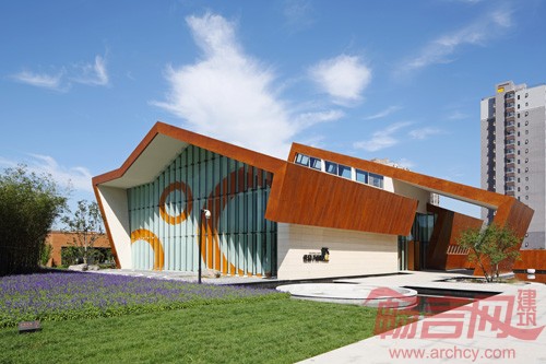 本案利用地块内配套小学的风雨操场场地,鉴于前期作为项目销售展示中心,后期改造为风雨操场的使用要求,体育场馆的空间形态成为必然的选择。以“橙”作为楼盘的主题,就意味着受众群体的年轻、阳光和活力,体现于设计上,充分表达了建筑形体的张力和爆发力。从西侧的主要人流方向看过去,一条橙色的折线从北侧墙升起至建筑檐口,在空中“狠折”两下形成了屋顶的轮廓,一直延续到南侧,又向下折至地面。橙色折板的材质为天然木皮包裹的Parklex幕墙板材,它的颜色近似于橙红,既贴合主题又亲和自然。
